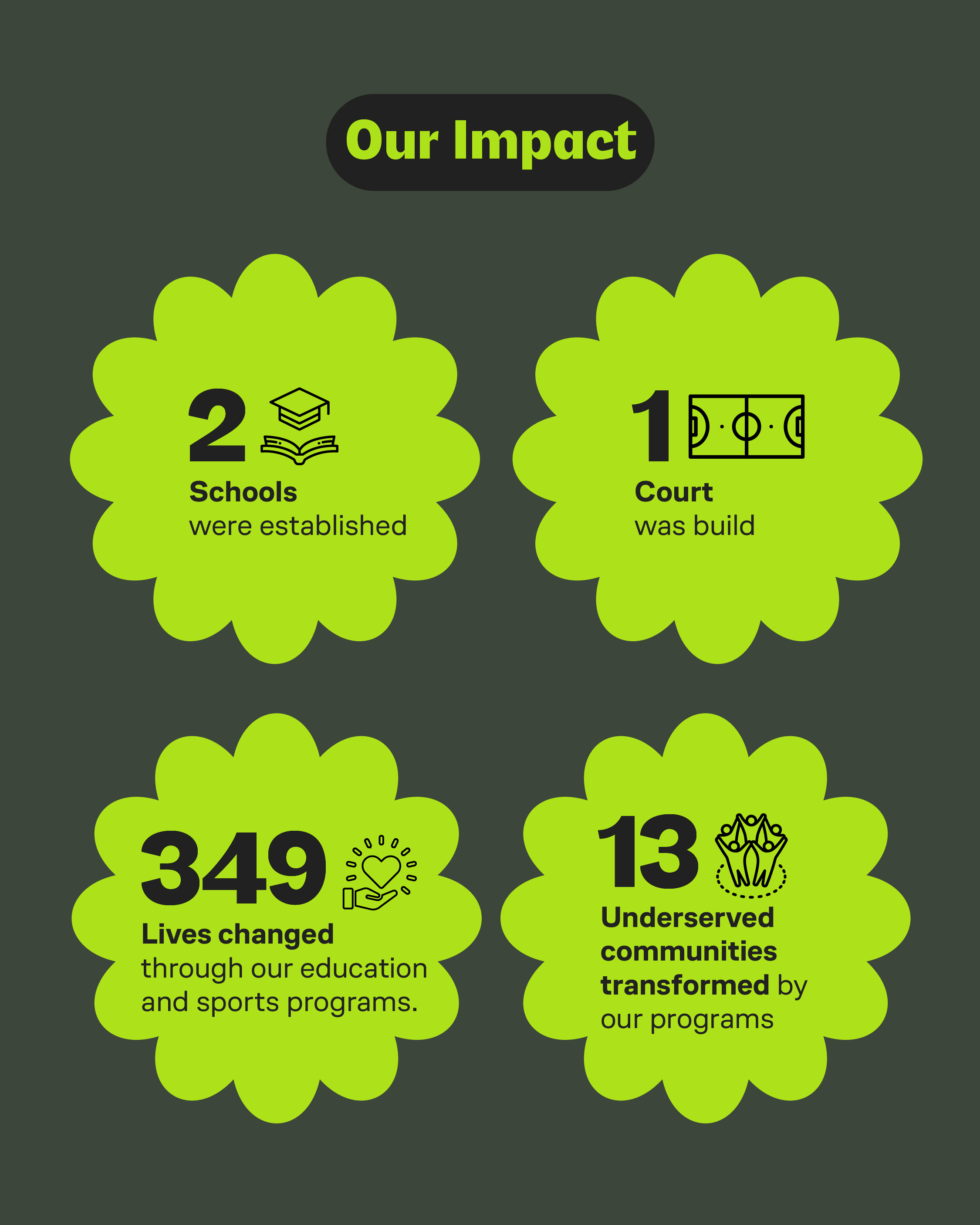 Number of kids helped, courts renovated, etc.